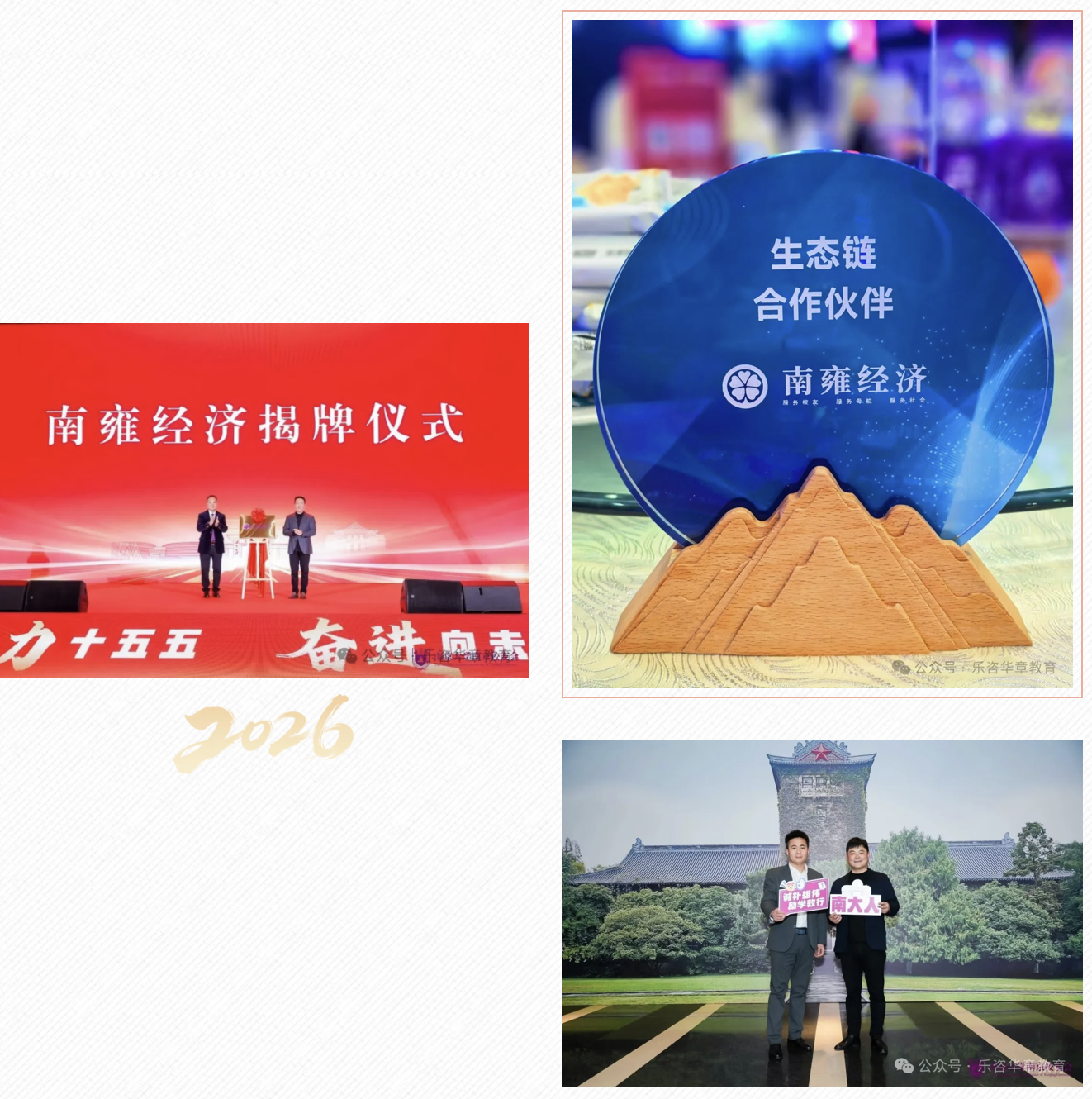 2026年1月18日,在南京大学南京校友会举办的2026南雍荟迎新大会暨年会上,凝聚校友力量、旨在促进实践共赢的“南雍经济平台”正式揭牌成立。作为深耕管理类联考辅导领域24年的考研机构,南京华章教育应邀出席盛会,并荣幸成为平台首批30家生态链合作伙伴之一。